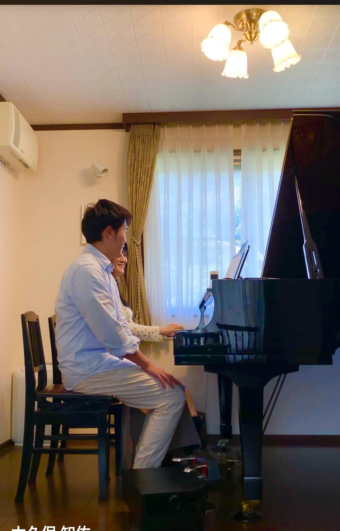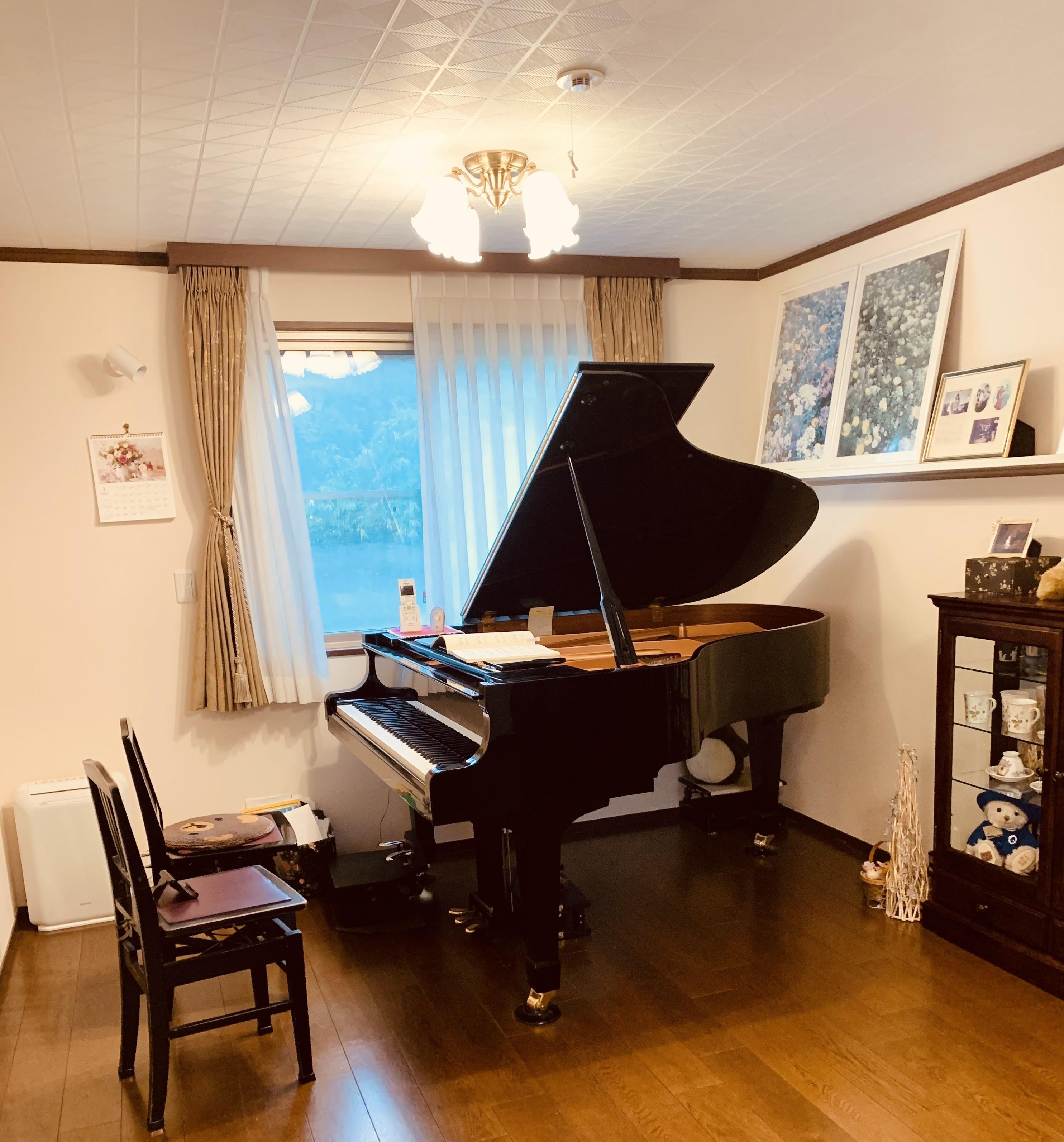 YAMAHA グランドピアノ C3。 12畳の旭化成ヘーベルハウスの防音室です。グランドピアノはYAMAHA浜松の工場に注文し、世界的ピアニストのミケランジェリ氏の専属調律師をされていた村上輝久氏と選定しました。普段は故小澤征爾氏のコンサートで調律を担当していた国分紳一郎氏にケアをお願いしており、深みのある柔らかい音と多彩な音色を引き出せるとても良い楽器を使用しています。